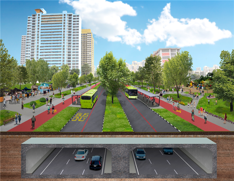 NSC は、陸上交通庁の「カー·ライト」 構想を支援を支援した地区でありており、地上道路は歩行者、 自転車、公共交通機関の優先道路となっています。NSC は、 移動のための道路として利用されるだけでなく、隣接する開発 地域とつながる歩行者専用道路網を結ぶ接続ポイントとしても 機能し、アクティビティ、イベント、レジャーのための空間として も活用されます。